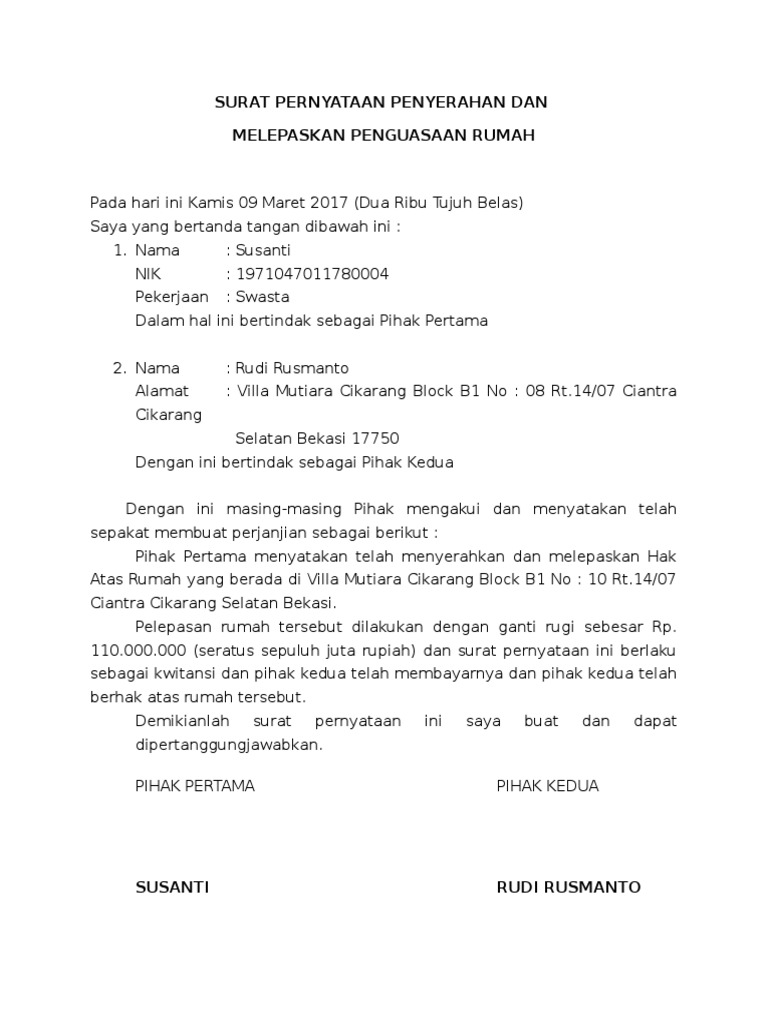 Surat Pernyataan Penyerahan Dan Melepaskan Rumah Pdf